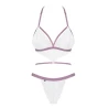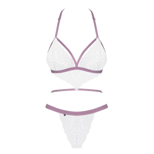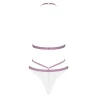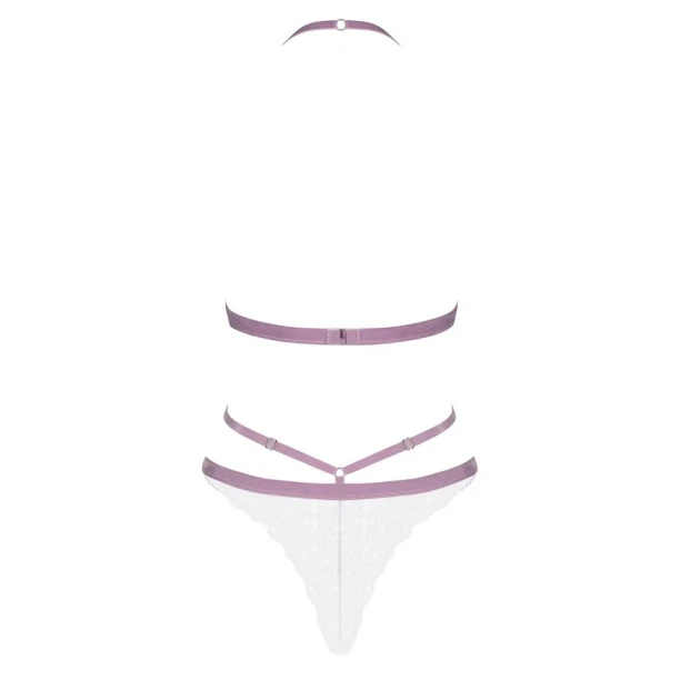 Боді Obsessive Lilyanne з напівпрозорого білого мережива з малюнком і вузьких смуг контрастного бузкового кольору.