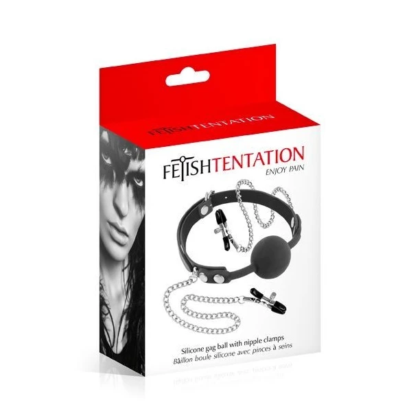 Кляп Fetish Tentation Gag Ball with Nipple Clamps — класичний кляп-кулька, доповнений затискачами на соски.