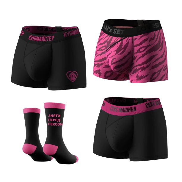 - до набору входять труси «Тигр», «Кунімайстер» та «Секс машина» і три пари шкарпеток «Зняти перед сексом»;