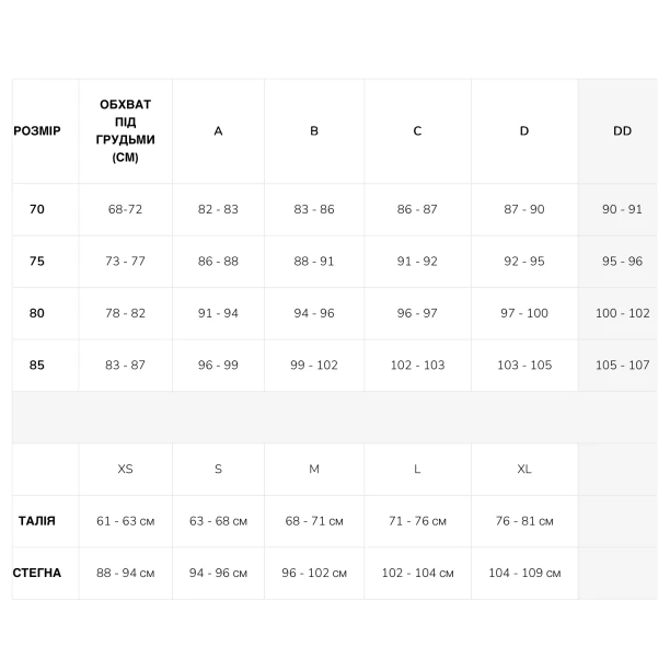 - під бюстом: 73-77 см;