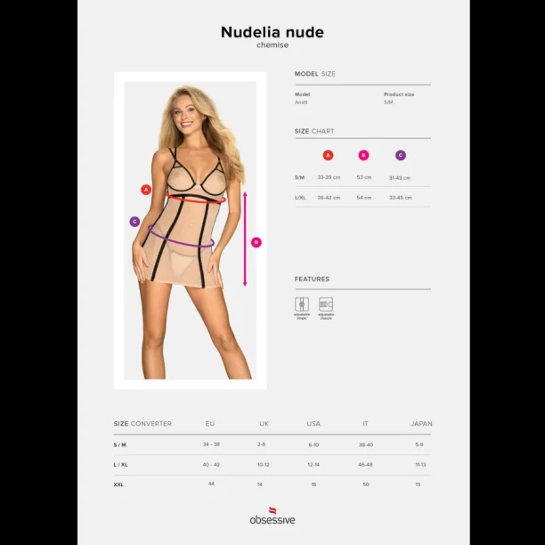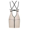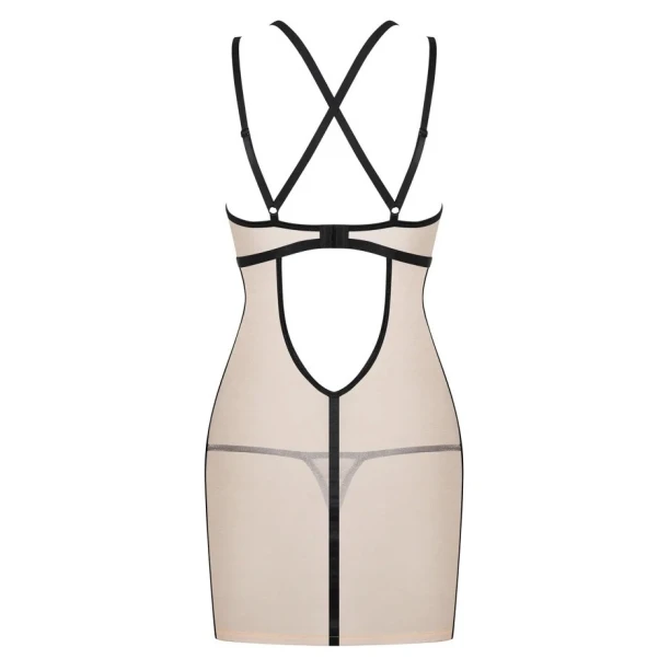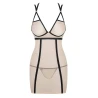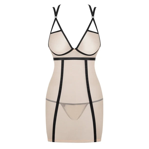 Пеньюар зі стрингами Obsessive Nudelia виконаний з прозорої бежевої еластичної сіточки і контрастної обробки — чорних ремінців і тесемок.