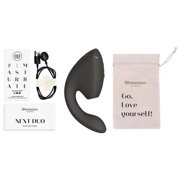 У комплекті: Womanizer Next Duo, додаткова насадка (розмір M), мішечок для зберігання з бавовни, USB-кабель, інструкція, наліпка #Imasturbate.